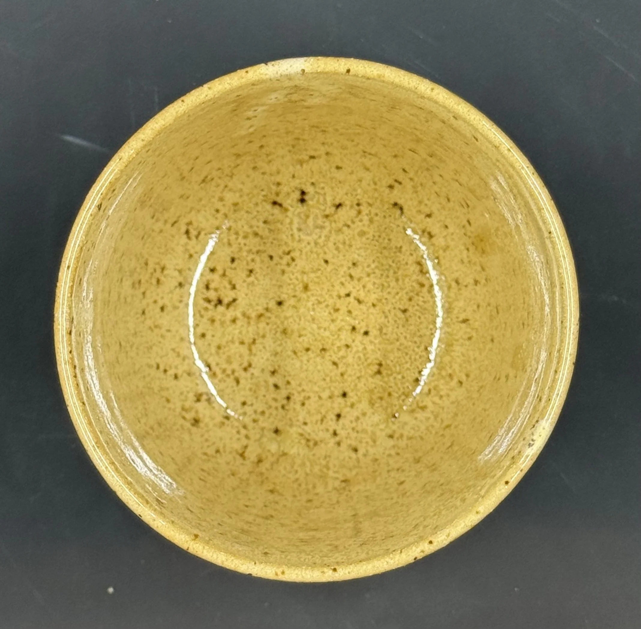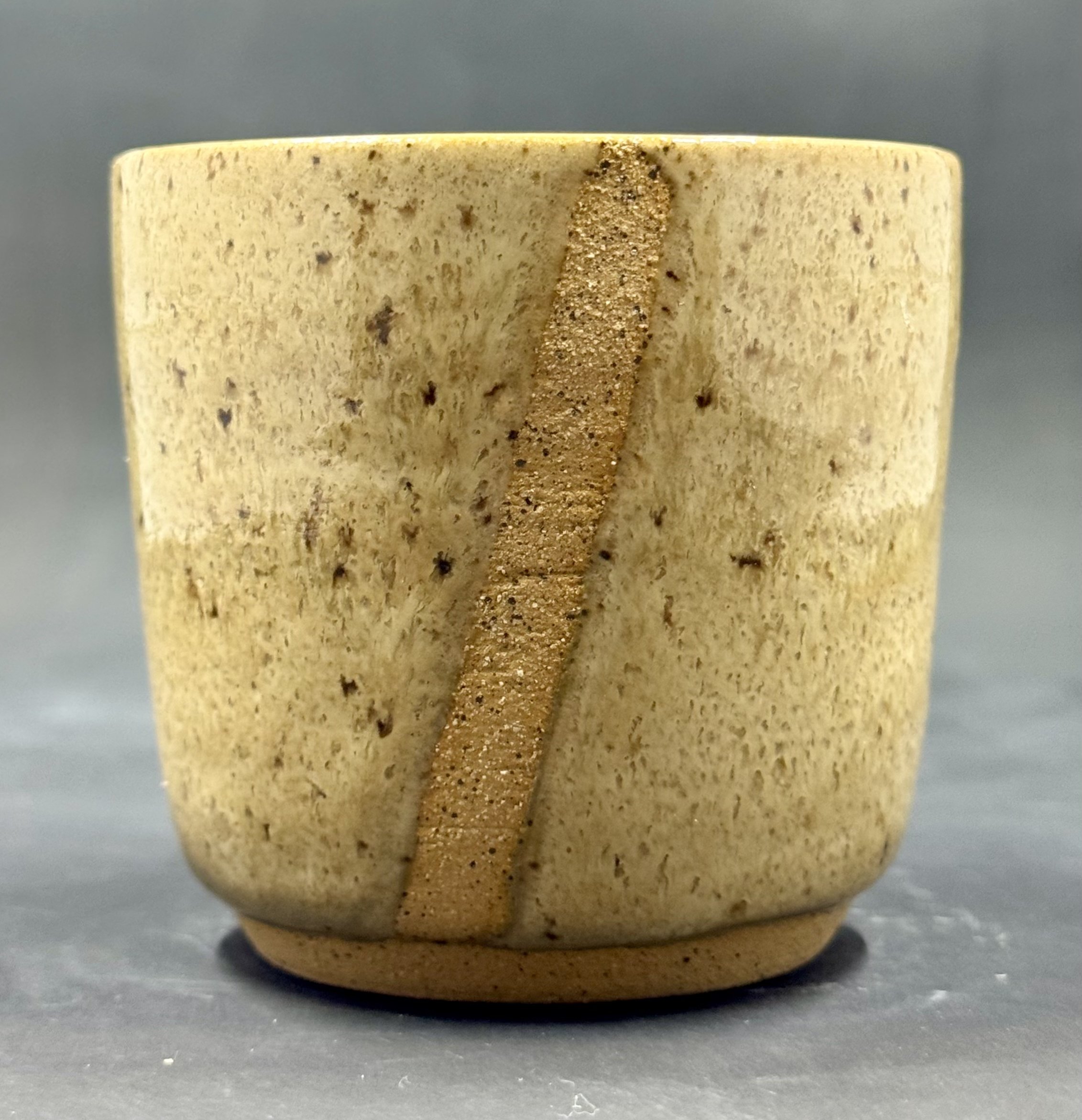 Wheel thrown speckled clay cup with tan/sandstone glaze.