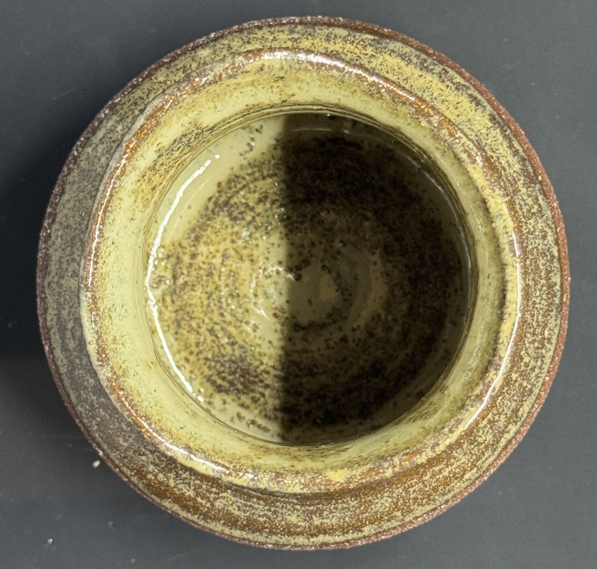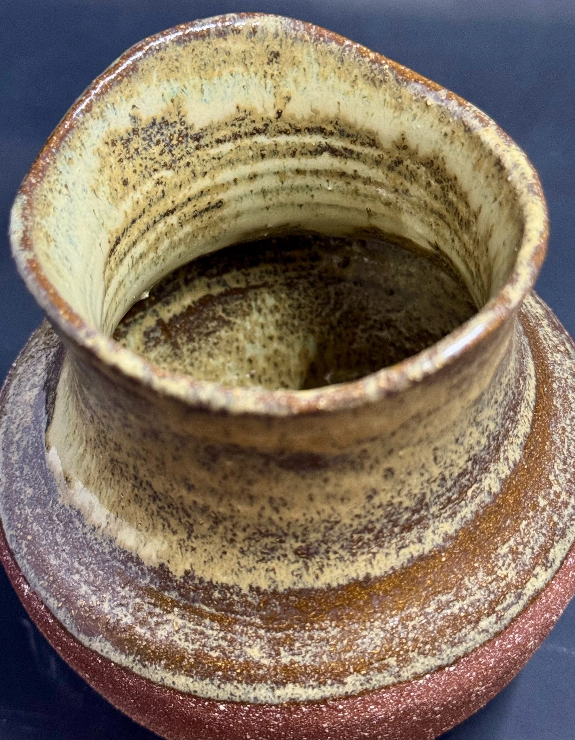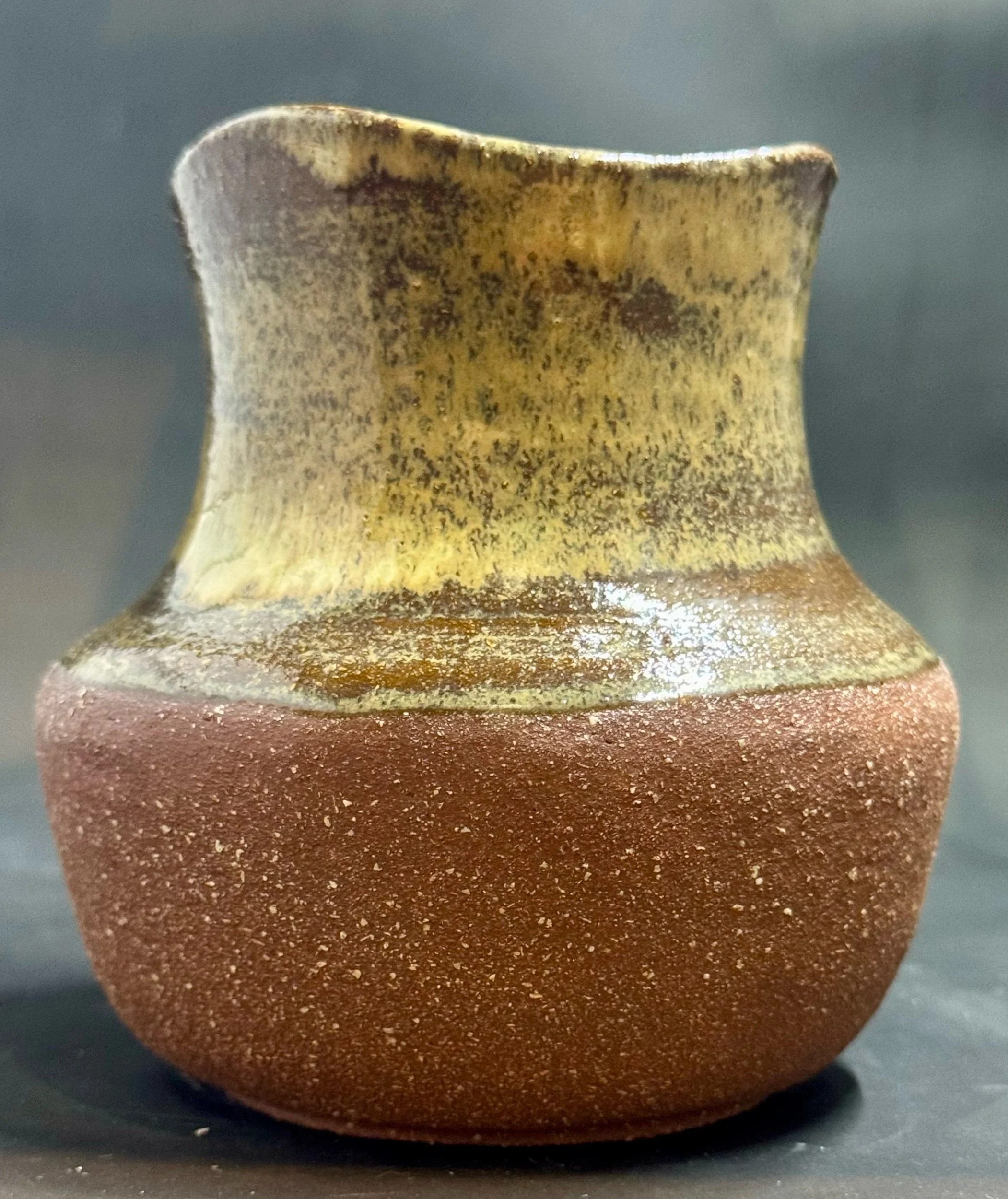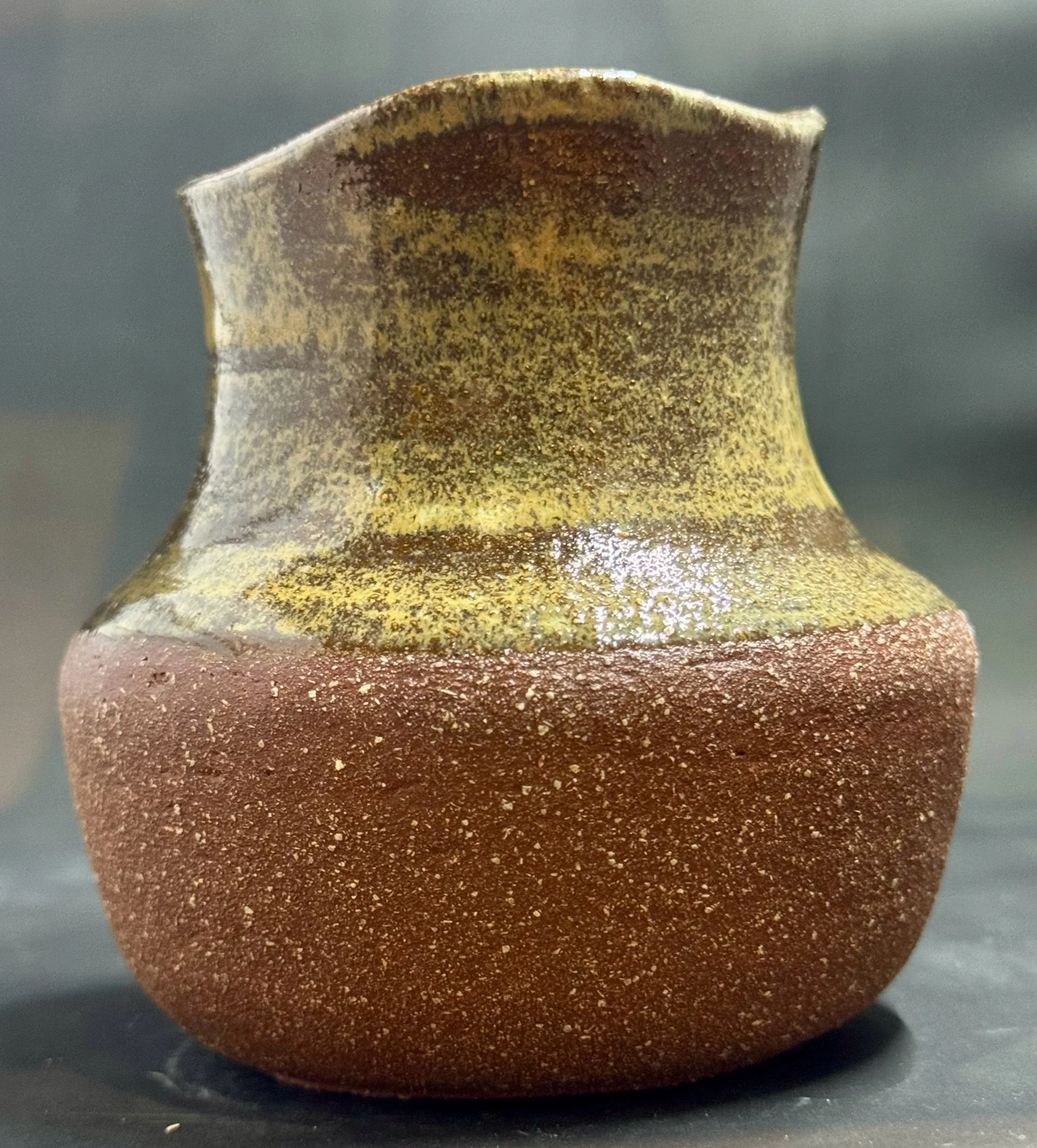 Wheel thrown dark speckled clay vase with wavy top. Finished in a golden/amber glaze.