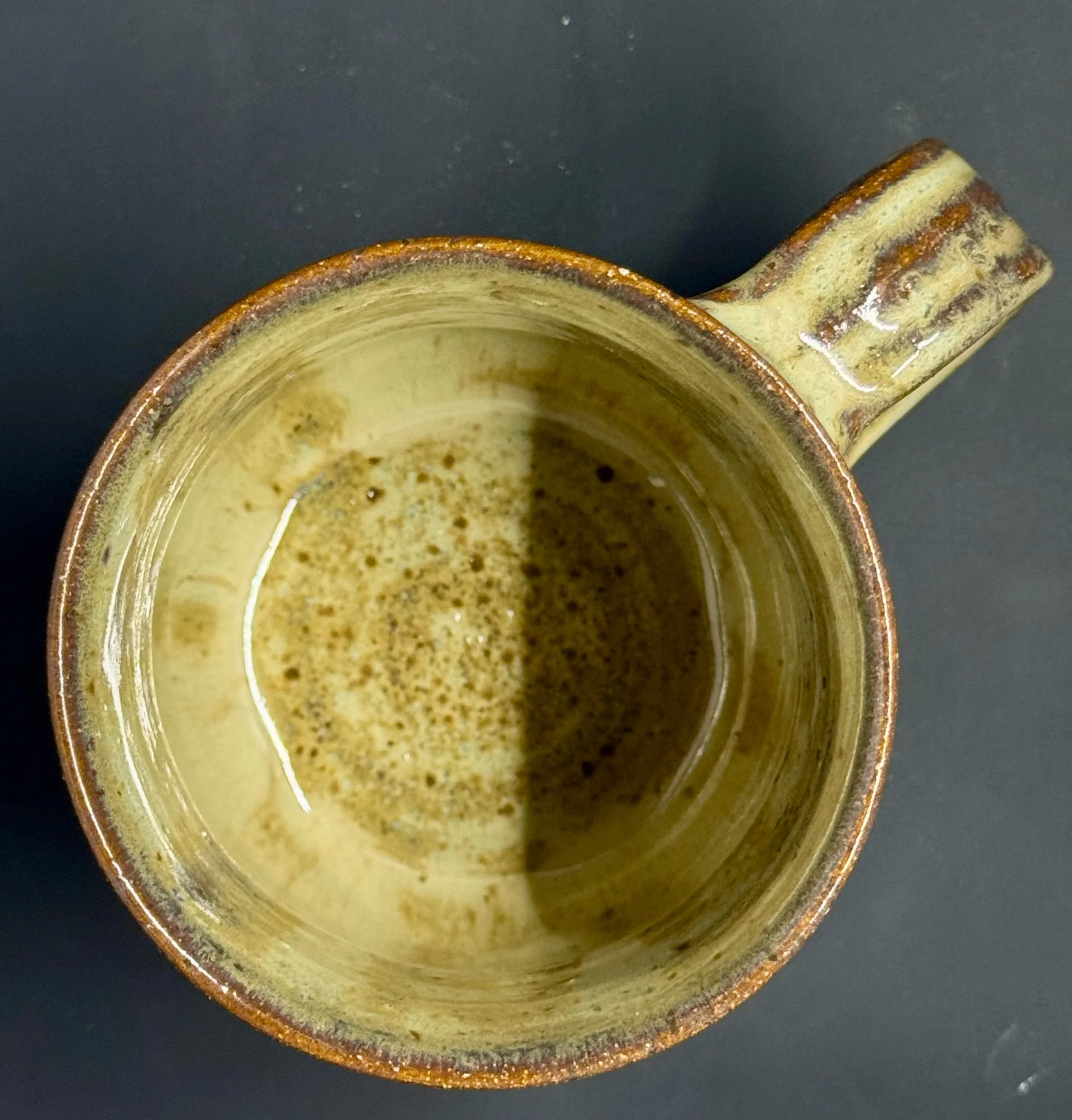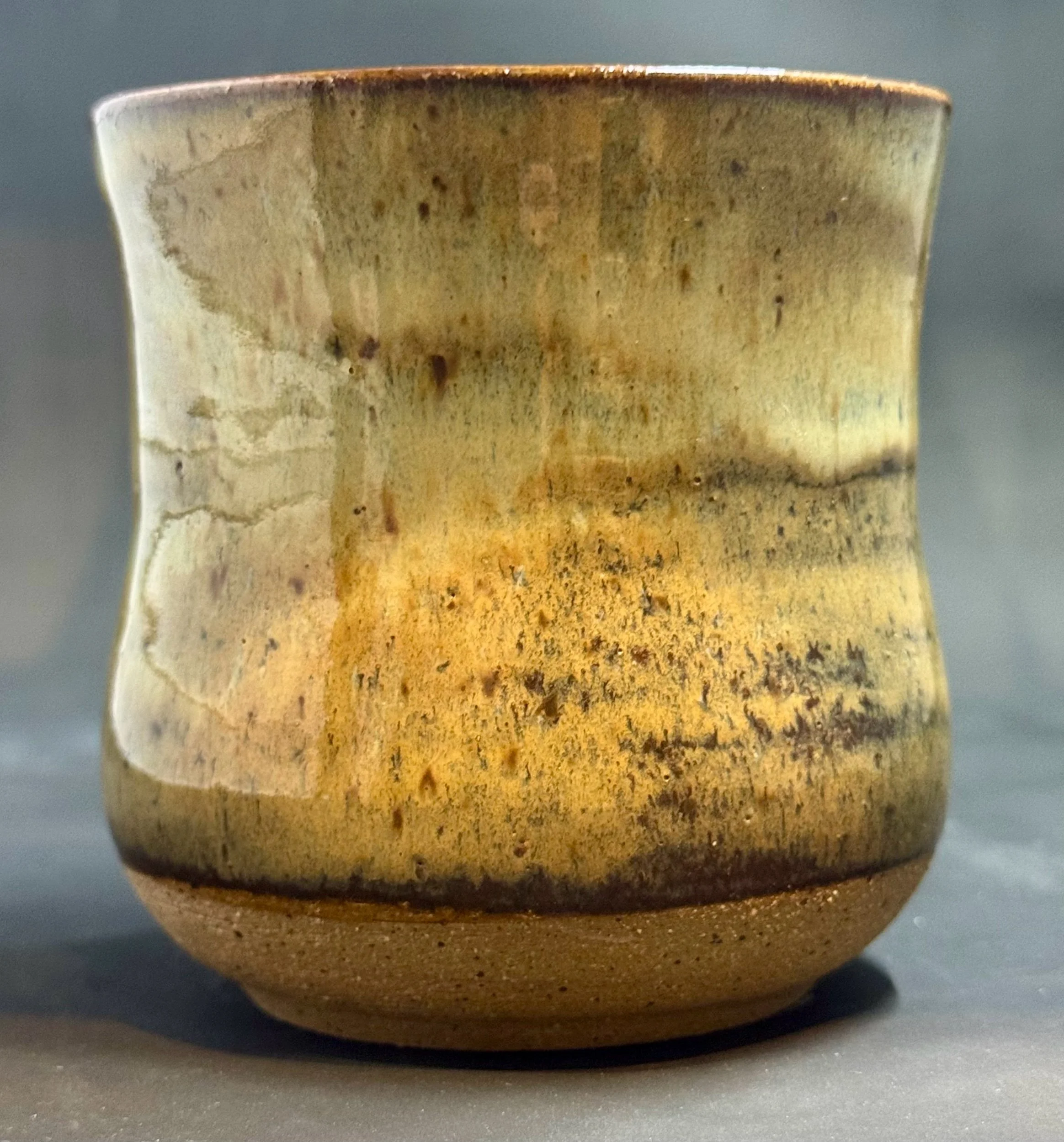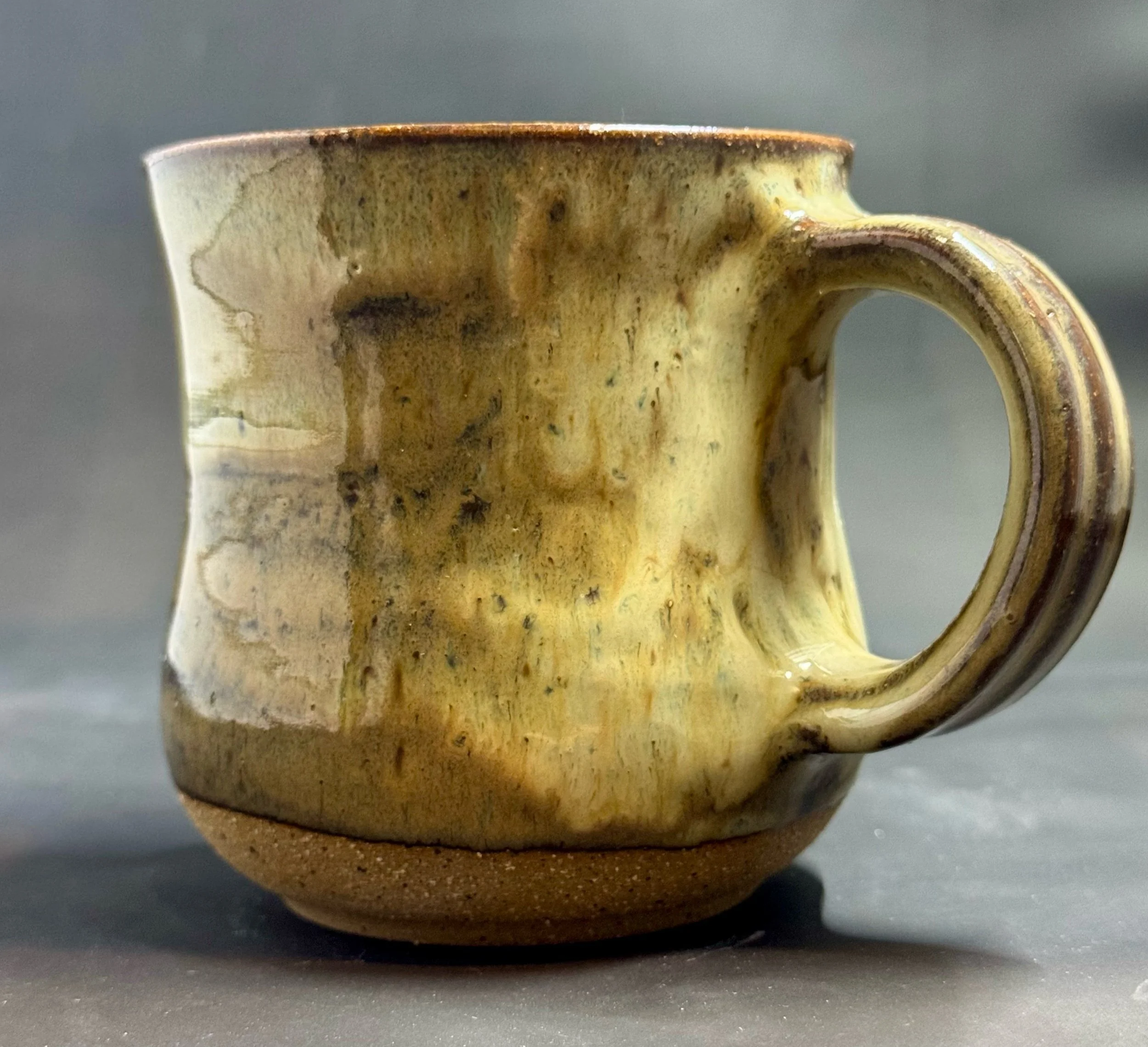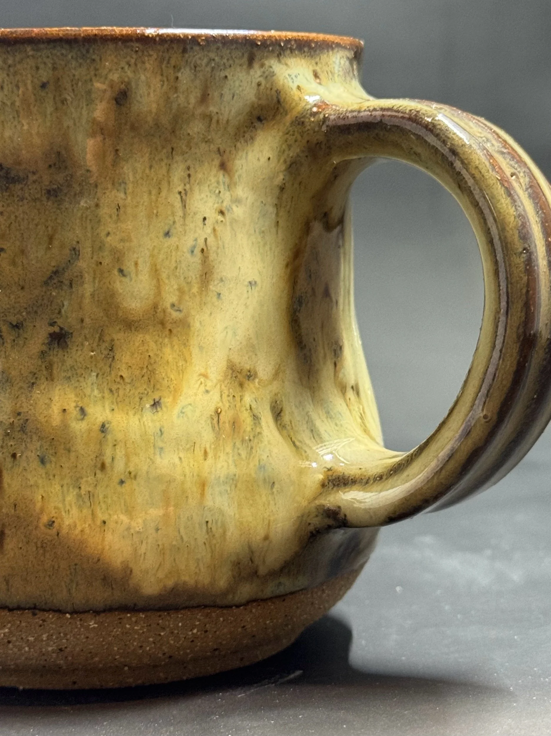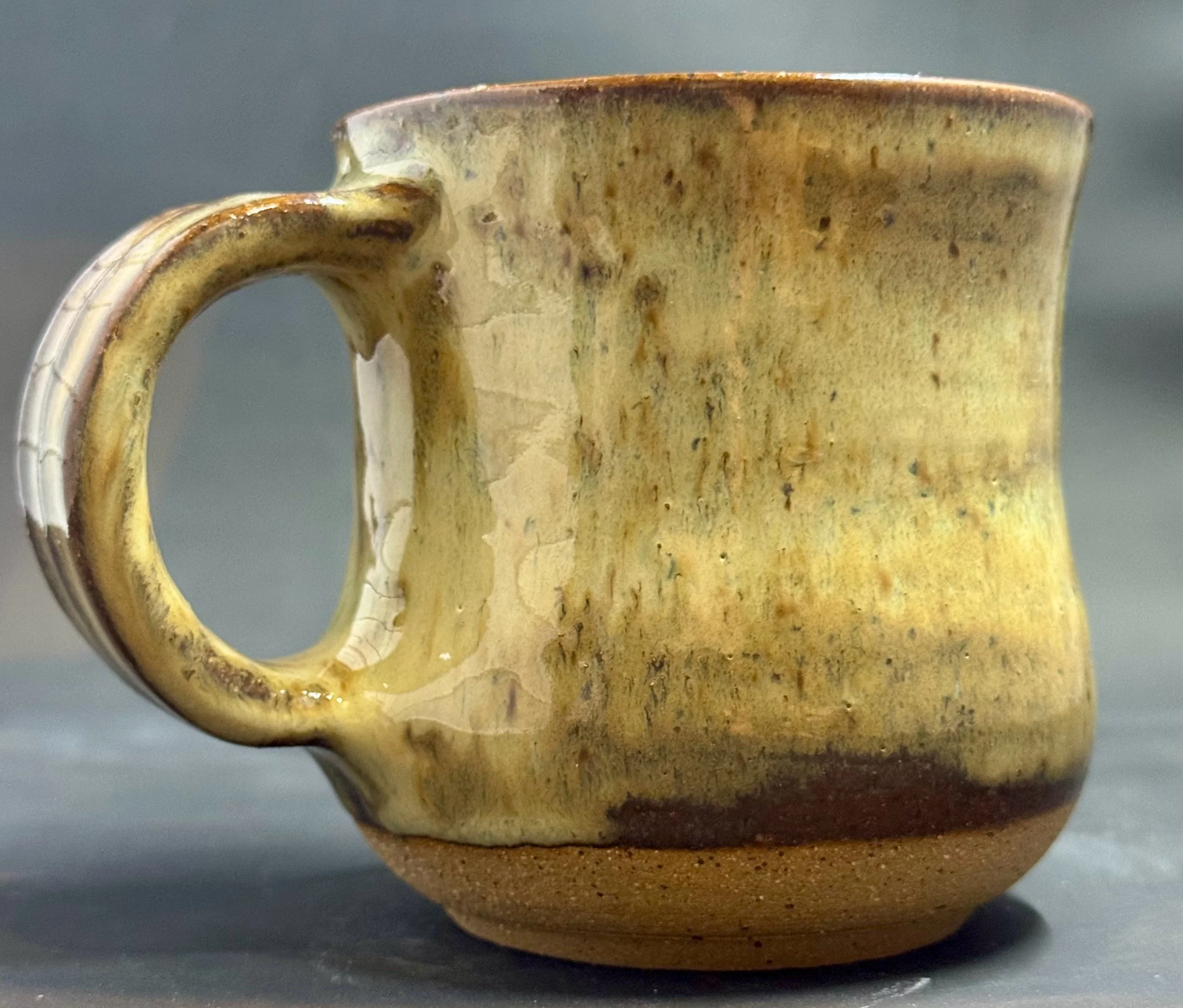Wheel thrown speckled dark clay mug with glossy tan/brown glazes with hints of blue.