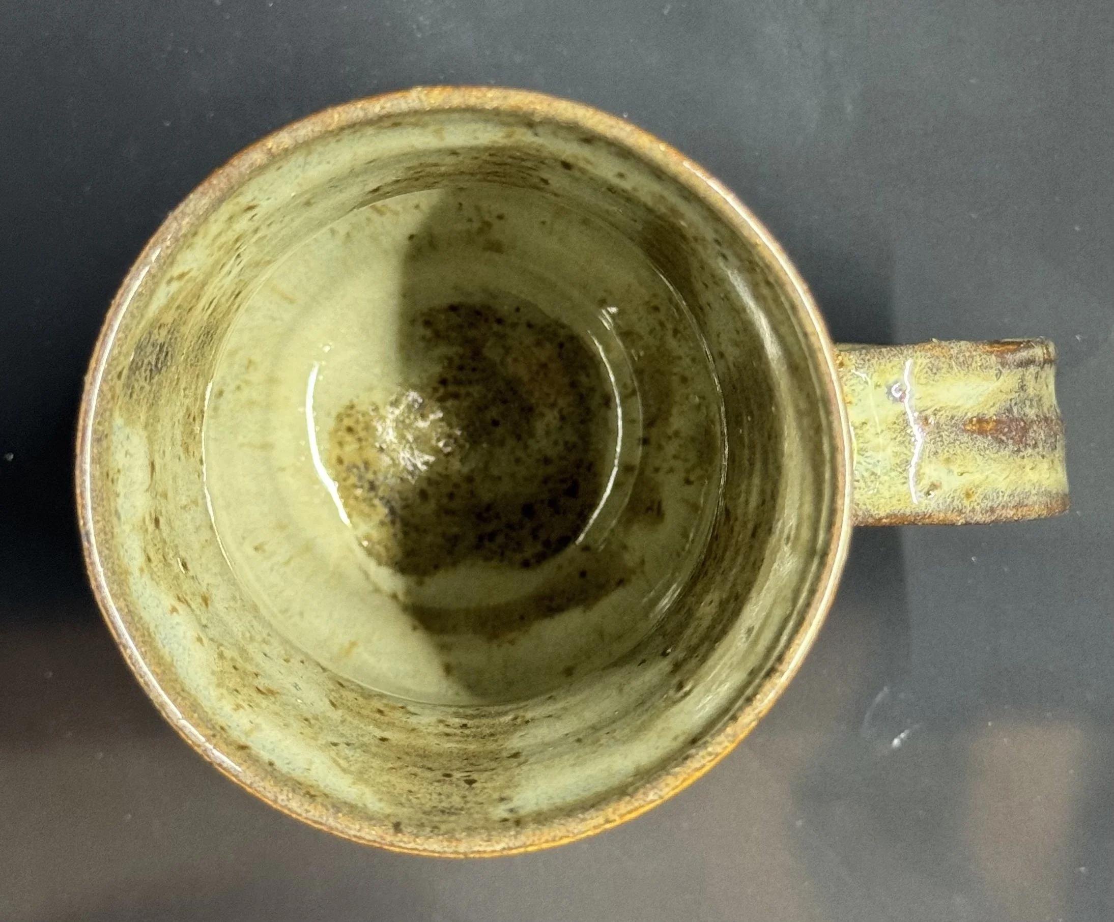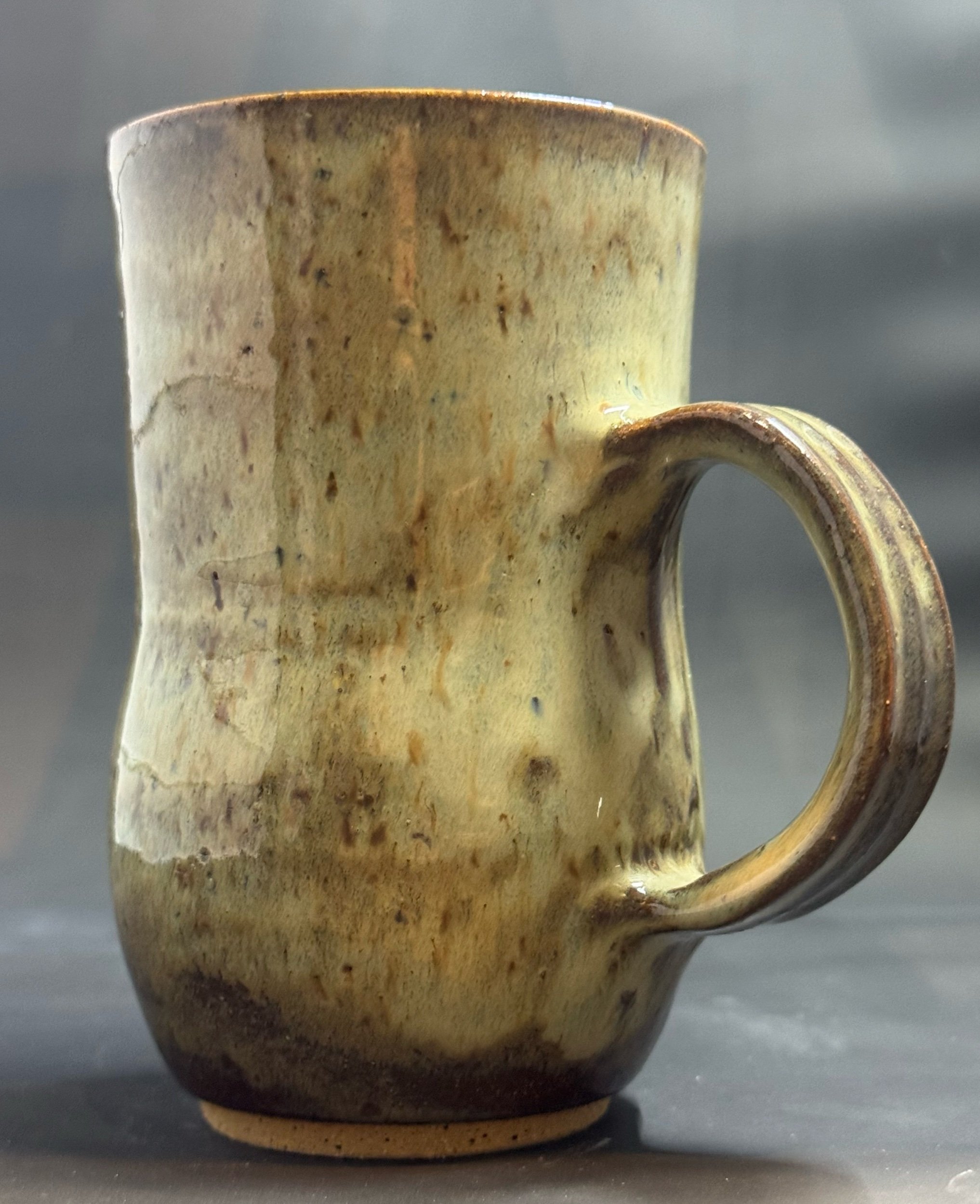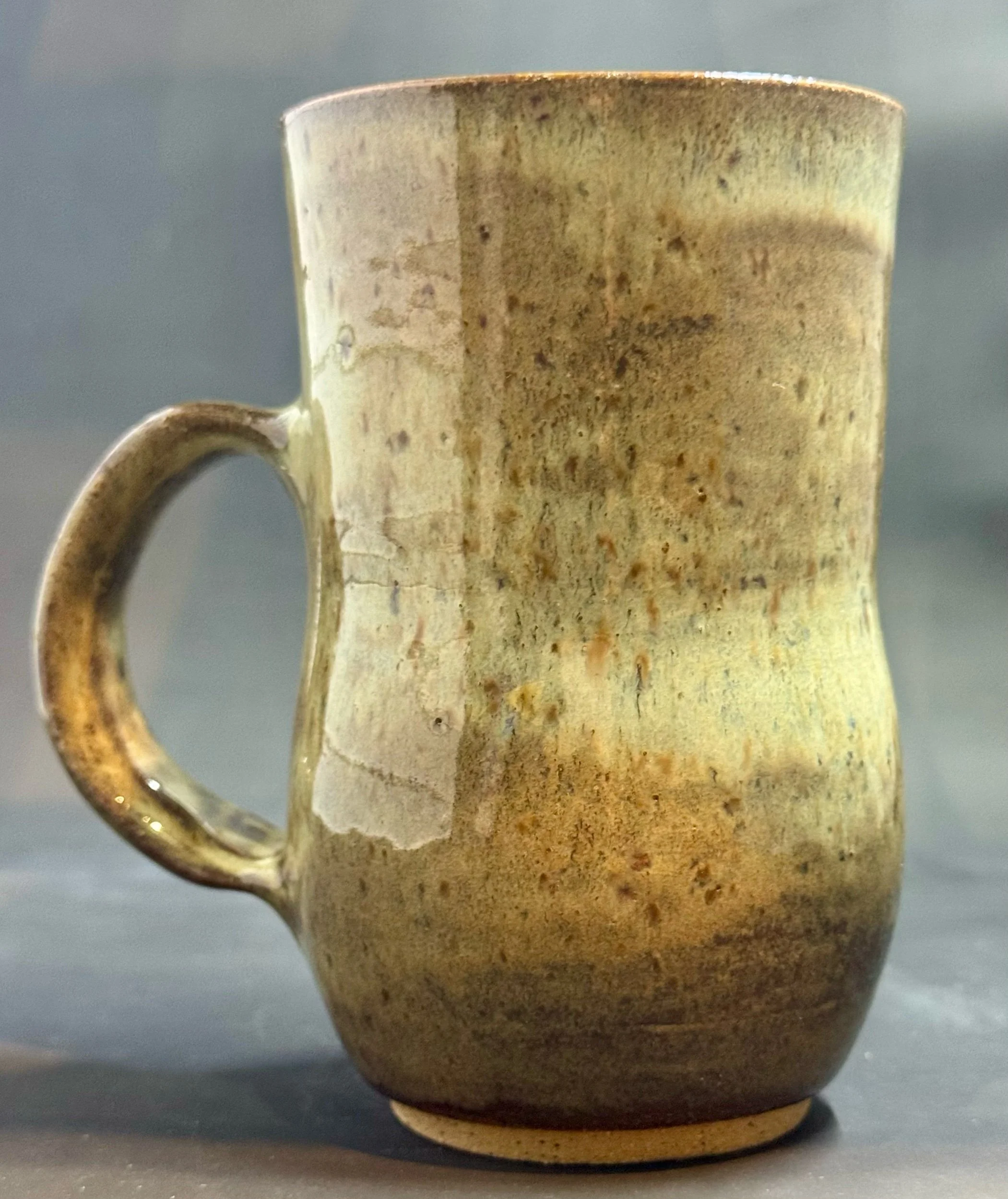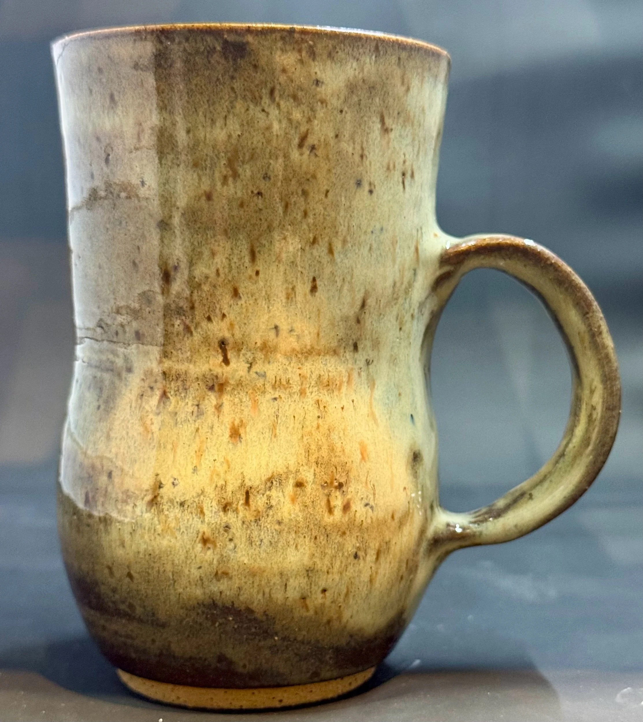 Wheel thrown speckled dark clay mug with glossy tan/brown glazes with hints of blue.