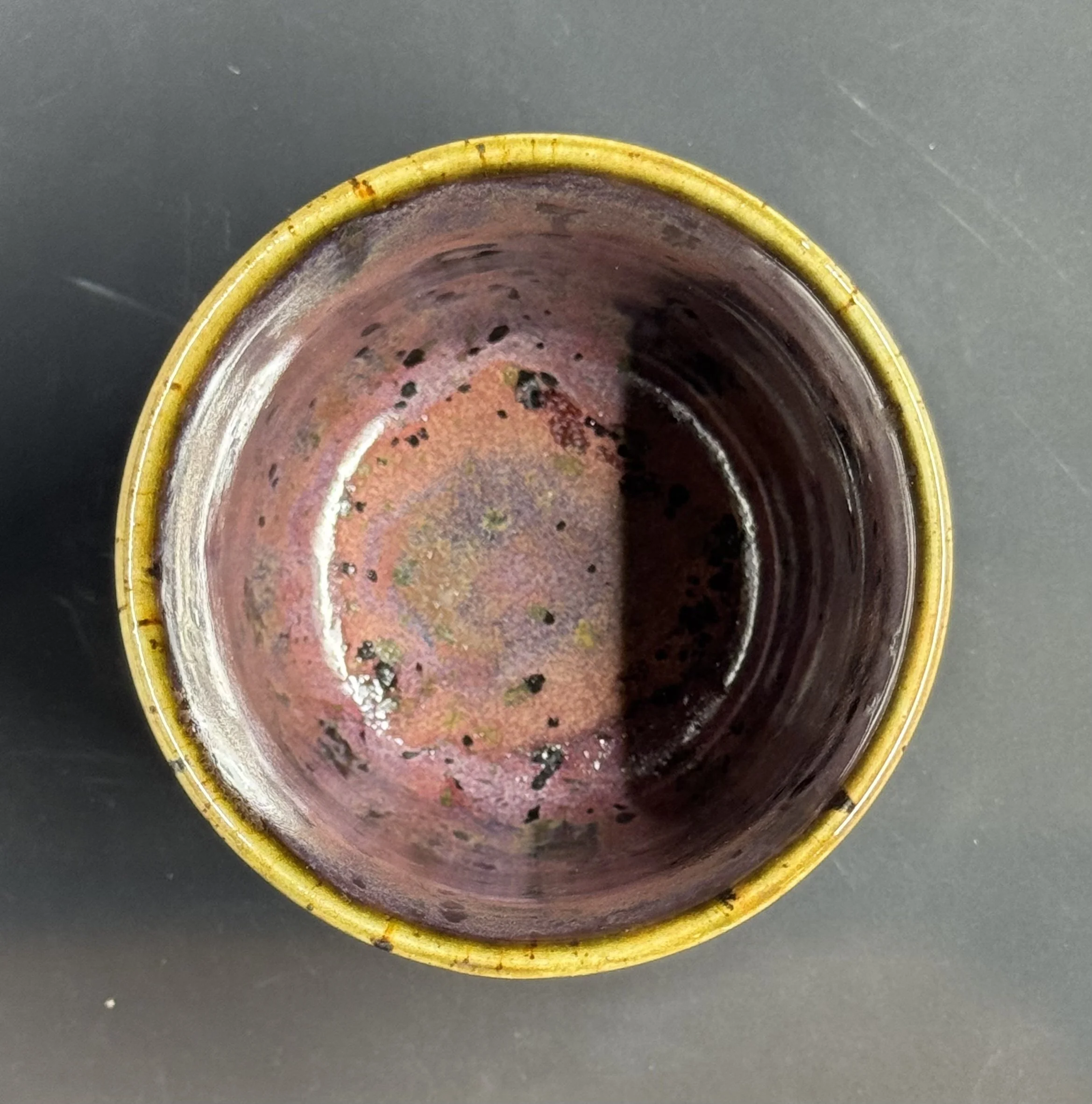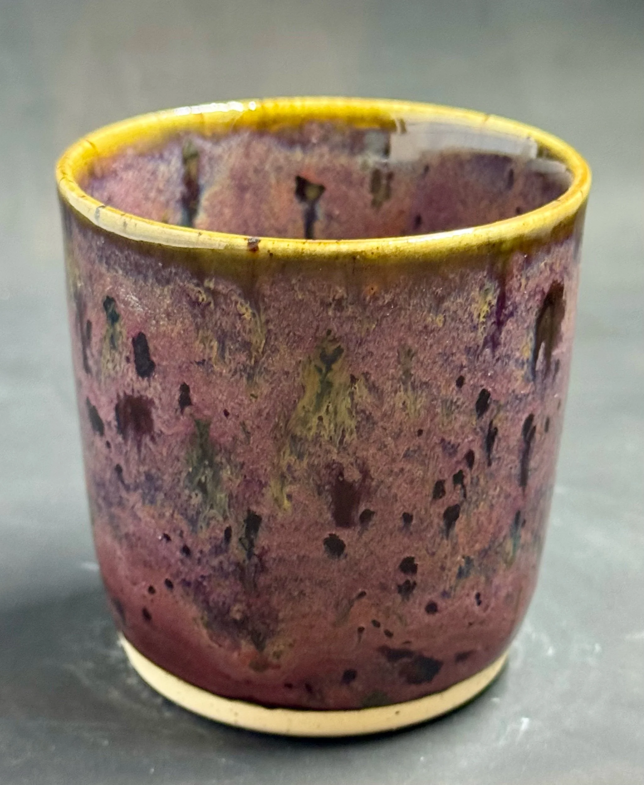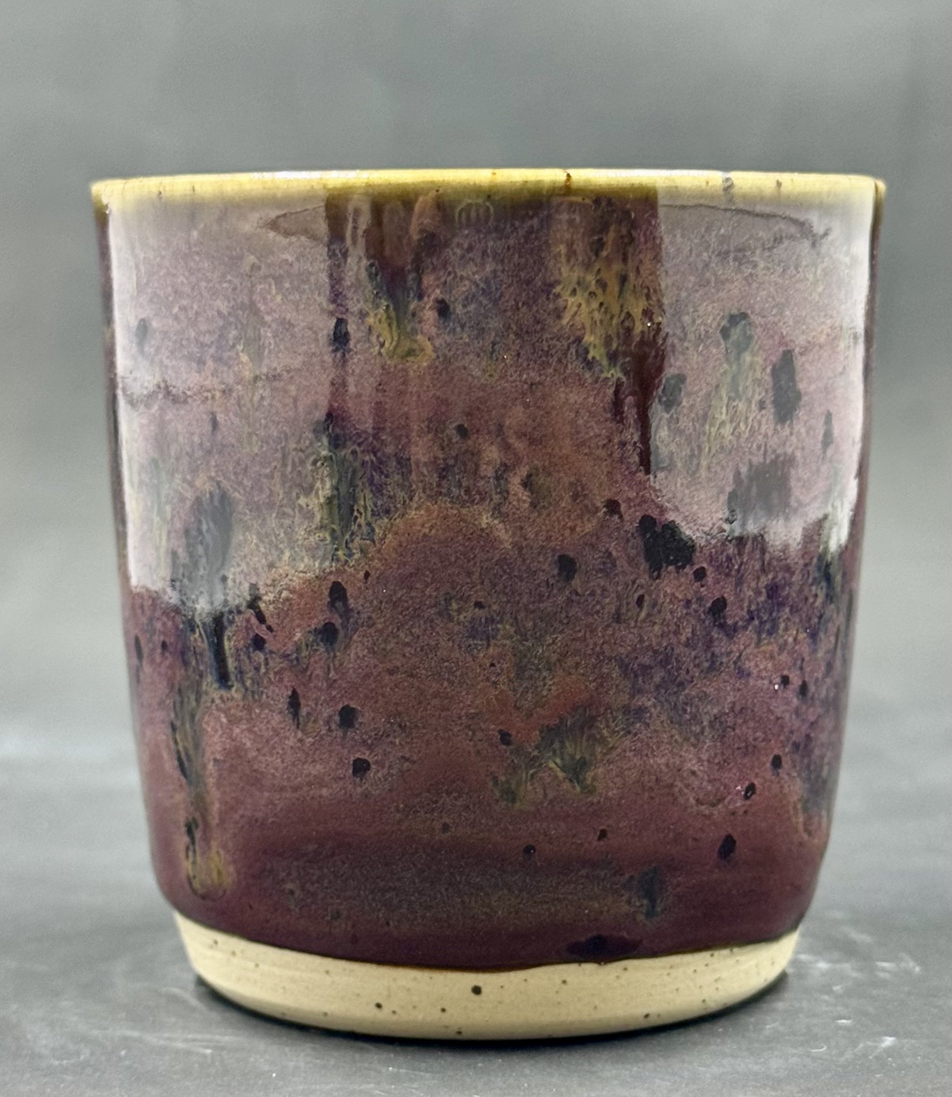 Wheel thrown speckled cup with purple oil spill glaze.