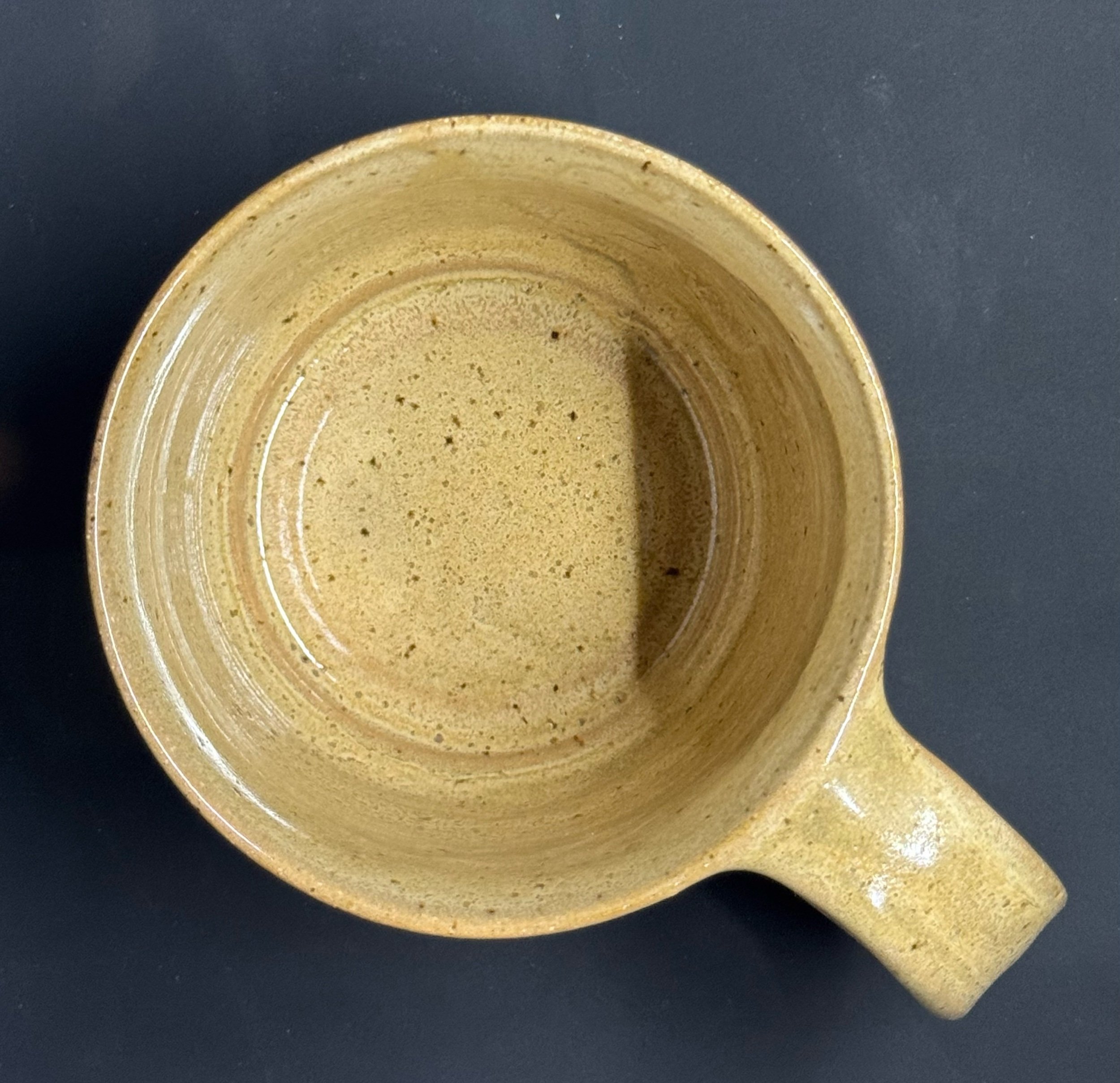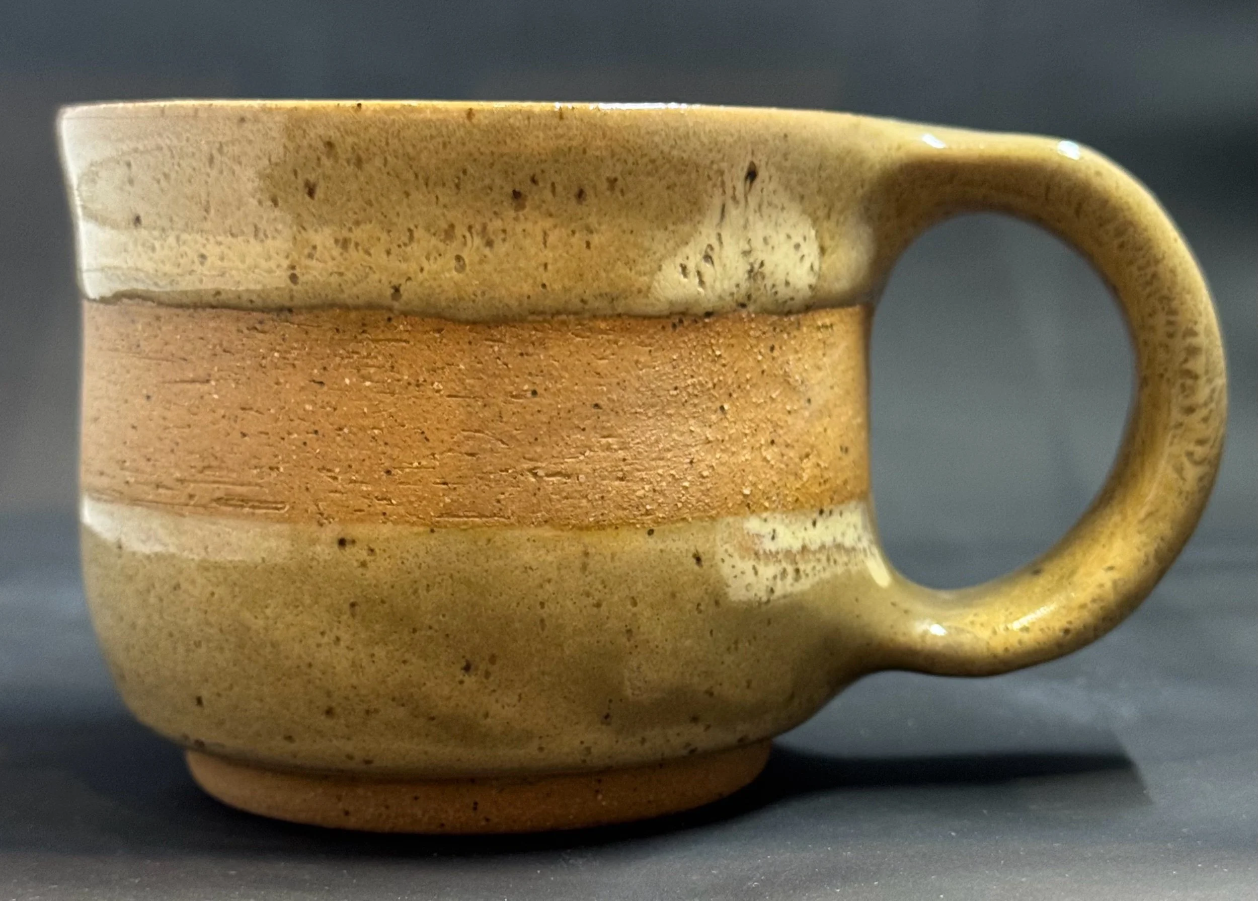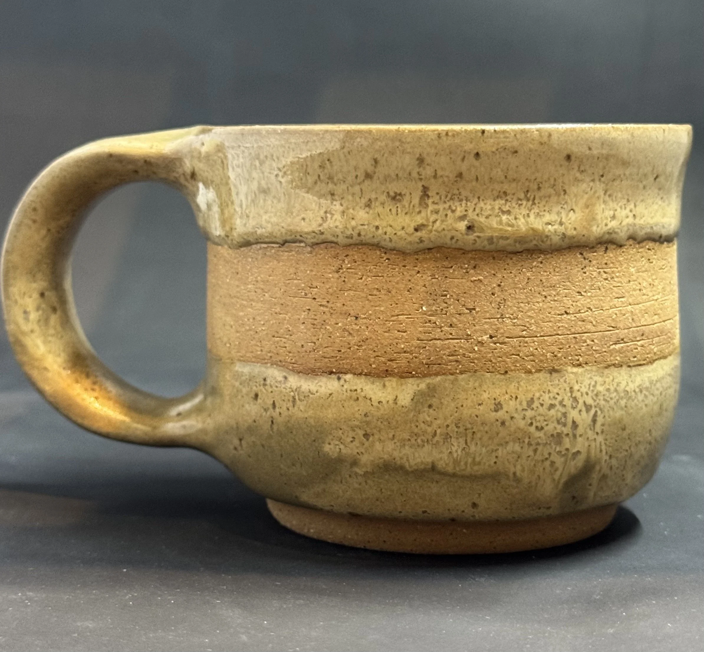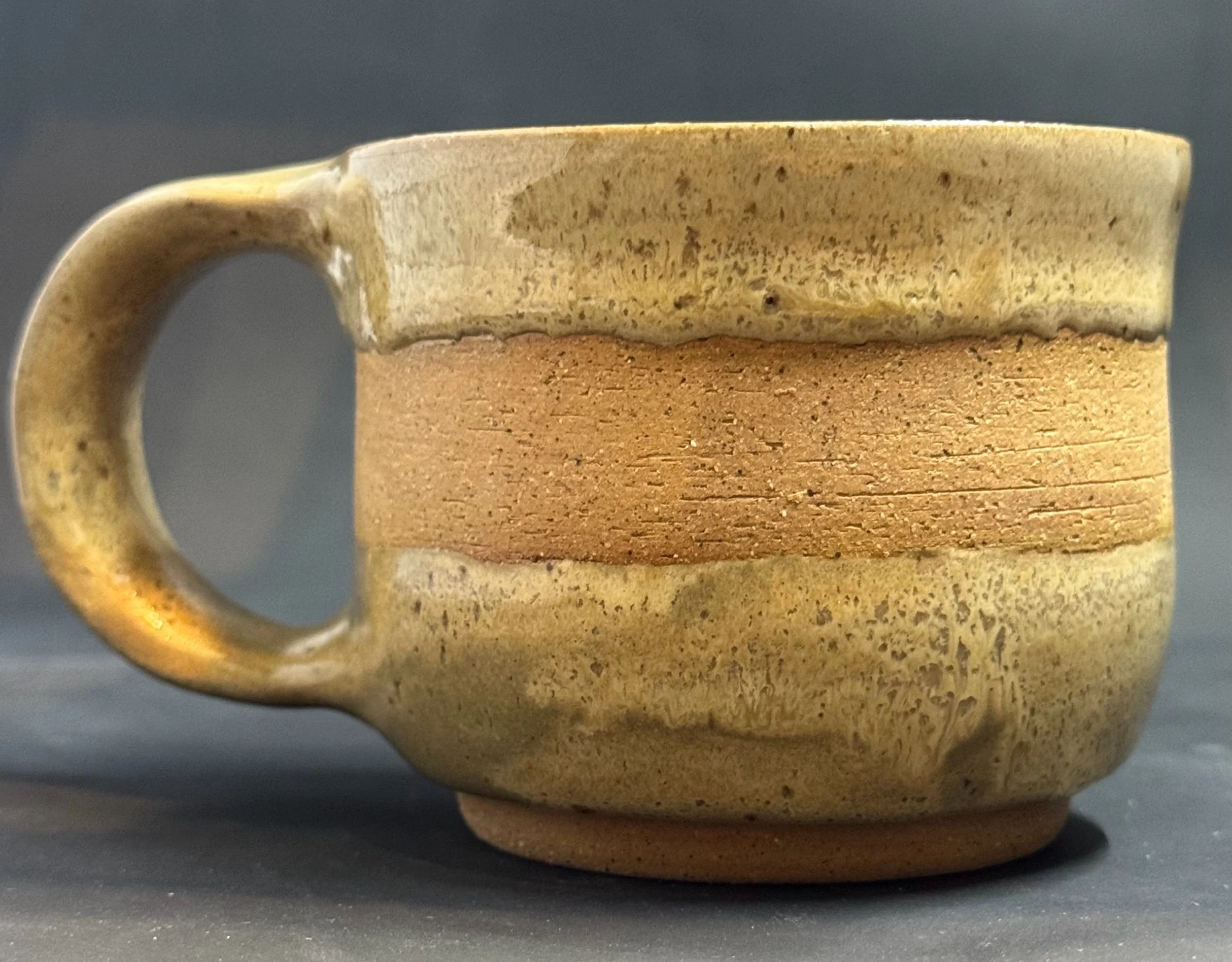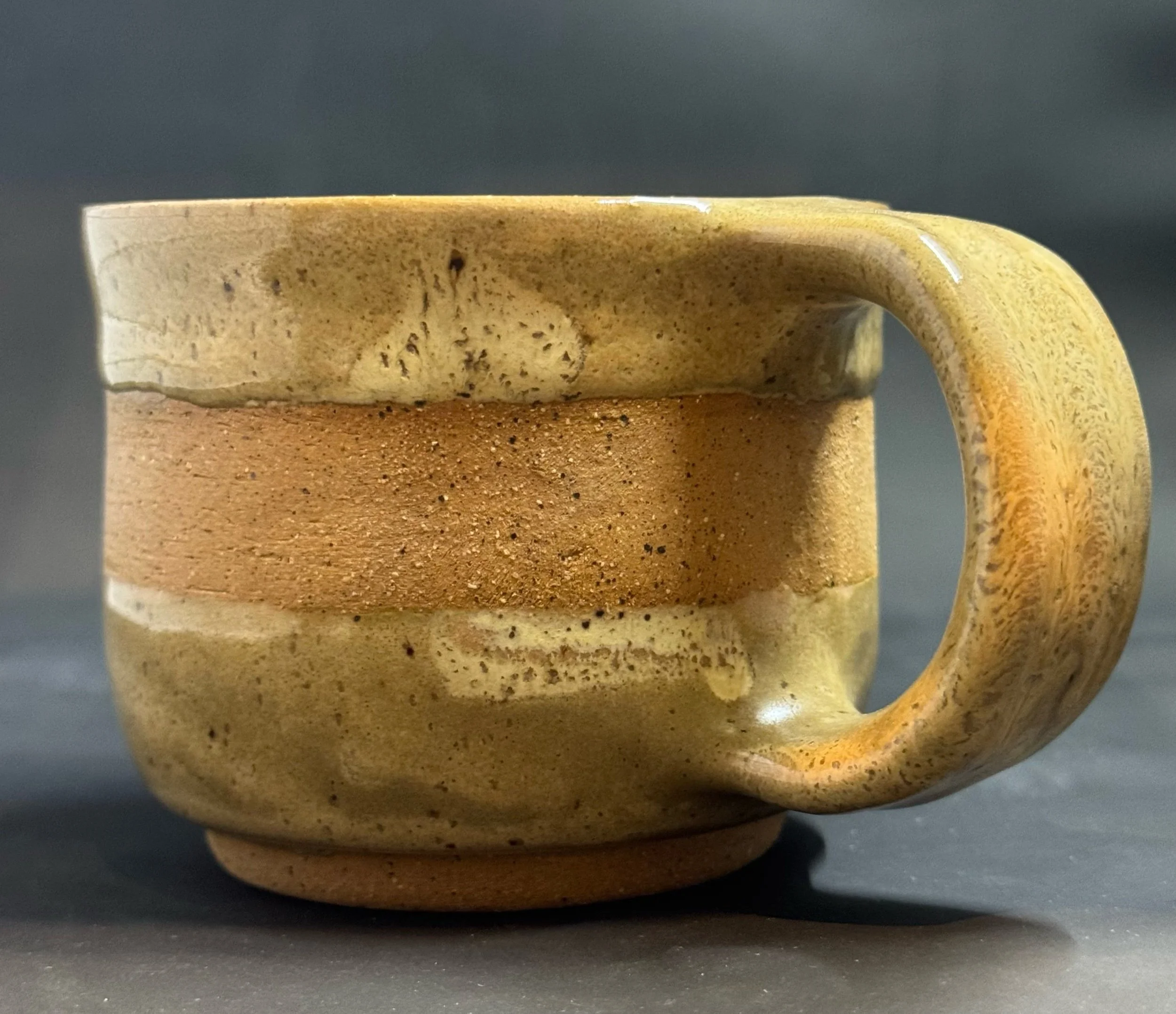 Wheel thrown speckled dark clay mug with tan/sandstone glaze.